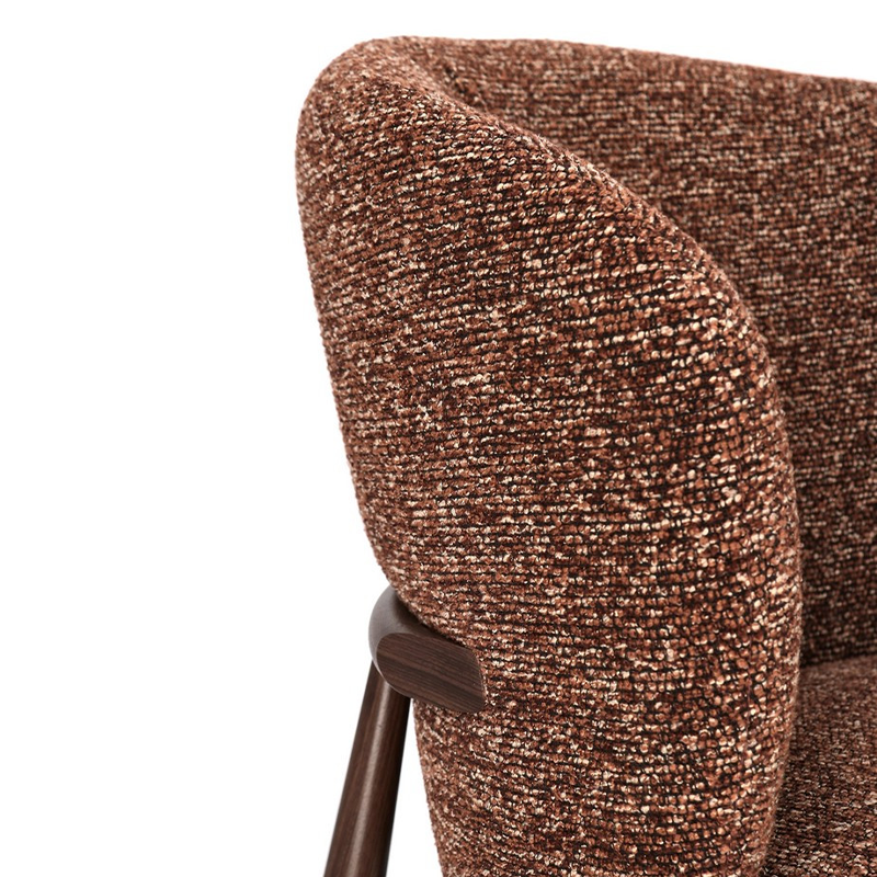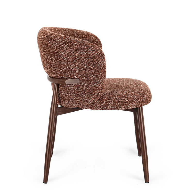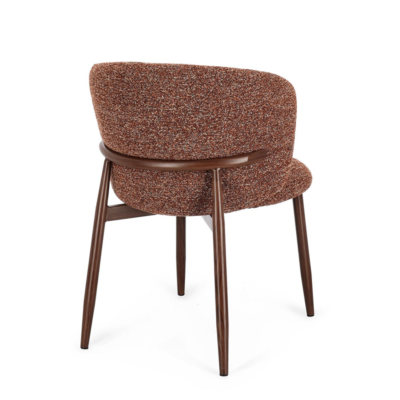 La silla Lía combina una silueta contemporánea con una estética cálida y sofisticada. Su tapizado en tono terracota aporta profundidad cromática y una sensación acogedora al espacio. La estructura en nogal realza el diseño con un contraste natural y elegante. Una pieza pensada para interiores que buscan equilibrio entre diseño, confort y carácter,