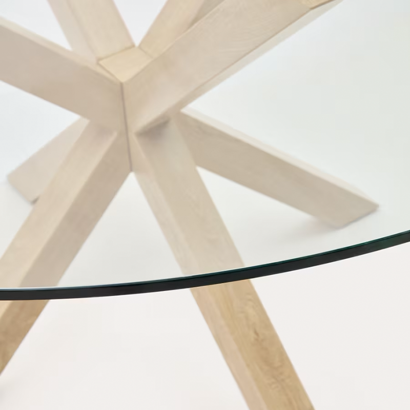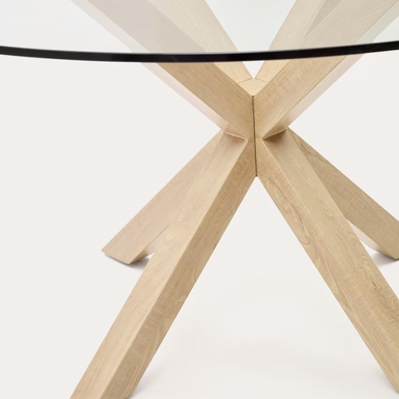 Mesa Yupo redonda 150cm sobre de cristal y patas de acero efecto madera